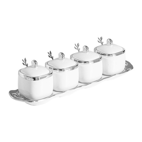Venta al por mayor, 4 piezas, juego de botes de cerámica blanca, contenedores de especias con soporte
